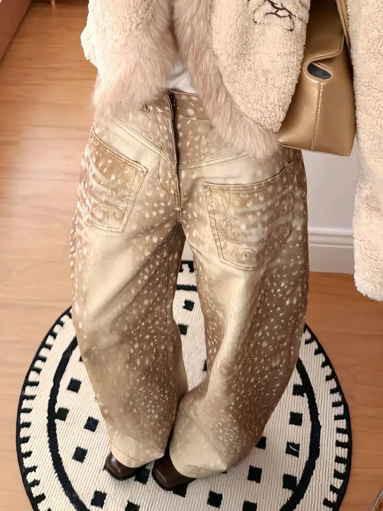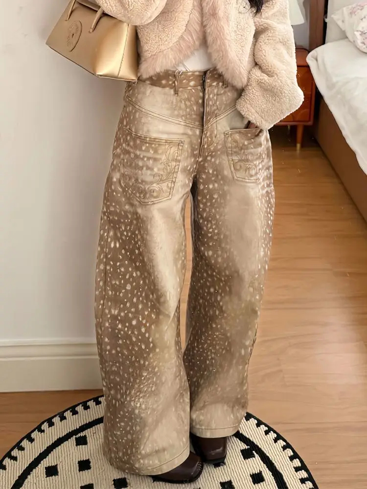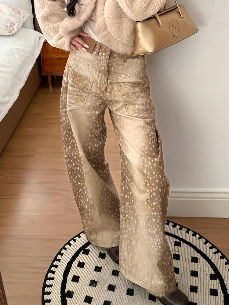 Animal Print Wide Leg Jeans For Women Distressed Washed Denim With Embroidery Casual Baggy Style Womens Jeans
