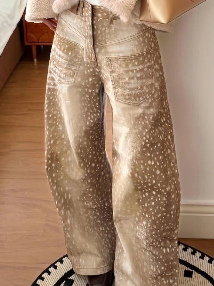 Make a bold statement with these Animal Print Wide Leg Jeans for Women. The relaxed, baggy silhouette flows into a dramatic wide leg, finished in a distressed denim wash. Subtle embroidery and painted accents add artisanal detail, while a slight stretch keeps the pair comfortable from morning to night. The high-rise waist flatters your shape and anchors the bold print with a poised, modern attitude.